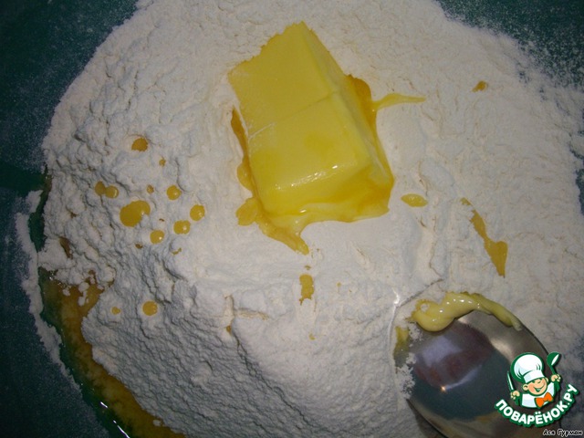 Просеем муку в большую миску, добавим соль и масло, разотрём в крошки.
