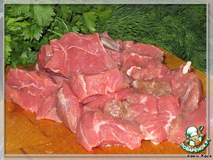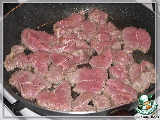 Мясо зачищаем от пленок и жилок, нарезаем плоскими кусочками, не мелко, с пол-ладошки, стараемся поперек волокна.
