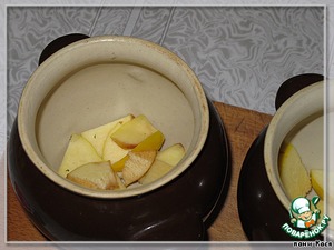 Айву чистим от сердцевинки, режем кусочками, кладем на дно горшочков немного.