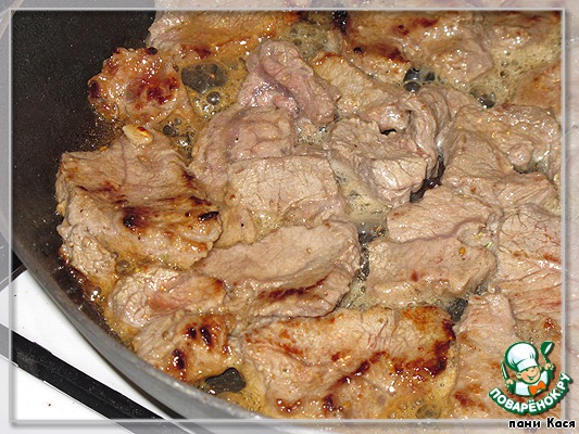 Мясо выкладываем на хорошо разогретую сковородку, в 1 слой. Нам надо, чтобы образовалась румяная корочка, но не вытек сок.