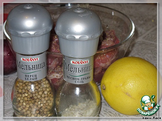 Чуть-чуть подмаринуем мясо, минут 15. Лимонный сок, приправы, соль.