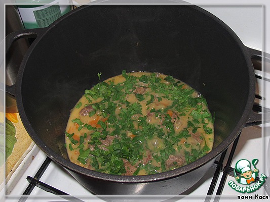 Заливаем мясо. Тушим полчаса на тихом огоньке. Добавляем петрушку. Пробуем - если надо, то досаливаем. Тушится еще минут 20, мясо должно быть мягким.