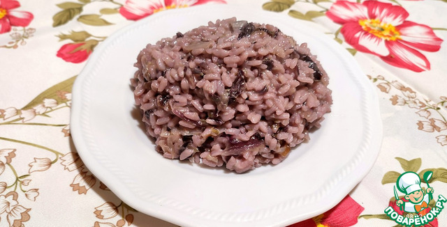 Вкуснейшее блюдо из риса и красного салата радиккио. Конечно, приготовление занимает 1 час времени, но не сложно! Когда не работаю и не бегаю по делам, люблю посидеть на кухне с книжечкой, а оно само там готовится! Объедение!!! И, опять же, ребeнка кормлю полезной, витаминной травой, а он и не сопротивляется!
