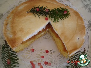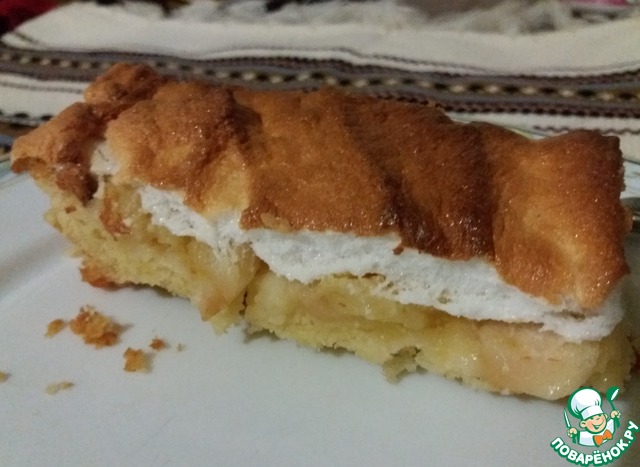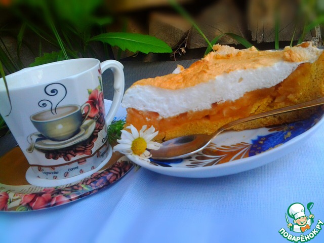 За это время взбить 4 белка с 2 ложками сахара, вынуть пирог, залить его белой взбитой массой, уменьшить температуру до минимума и выпекать еще 10-15 минут. -