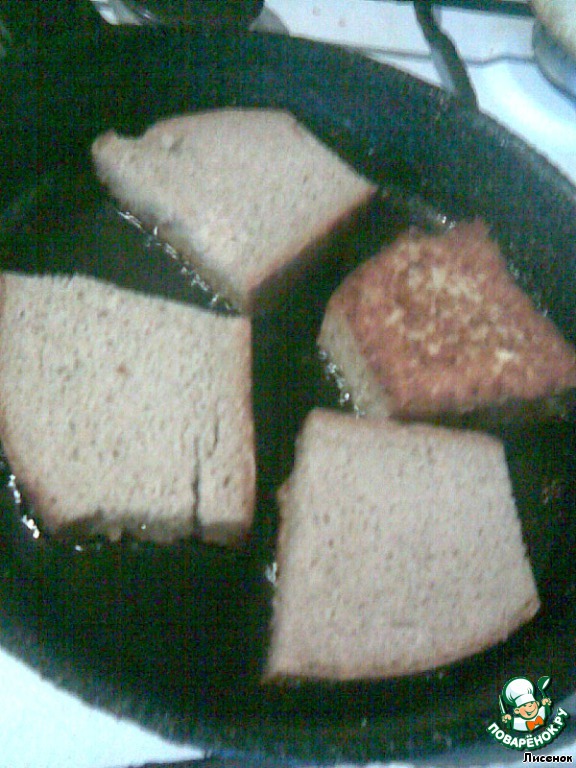 Заскалить сковородку с маслом и выкладывать бутики картофельной стороной вниз. И сразу-же убавить огонь почти до минимума. Жарить гренки около 10 минут. Потом перевернуть и поджарить сам хлеб.