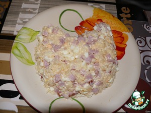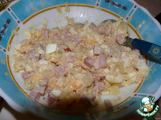 Сначала готовим салат. Для этого ананасы, два яйца, ветчину нарезаем мелкими кубиками, добавляем рис и заправляем майонезом. Одно яйцо оставляем для украшения. Солить - по желанию (я не солила).