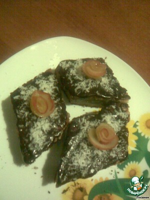 Я залила шоколадной глазурью, посыпала кокосовой стружкой (дети ее очень любят) и сделала из яблок розочки.
