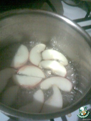 Cахар с водой довести до кипения и проварить в сиропе пластинки. Где-то до прозрачности. Но это смотря какие яблоки.