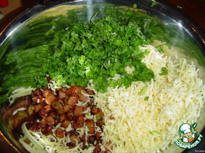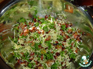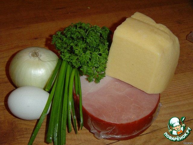 Обжаренную ветчину и лук смешать с петрушкой, зеленым луком и сыром.
