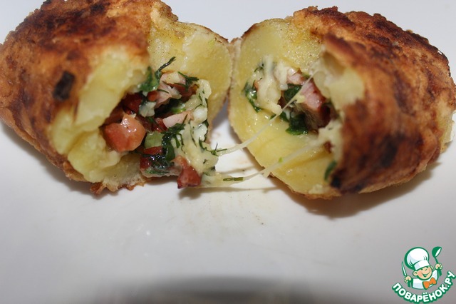 Наполняем половинки картофеля полученным фаршем, соединяем половинки, обваливаем их в муке, яйце, и опять в муке. Обжариваем во фритюре до золотистого цвета.