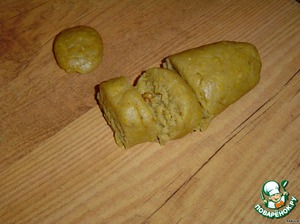 Раскатываем тесто колбаской, разделяем на кусочки.
