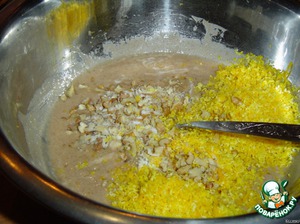 цедру апельсина, орехи. Постепенно добавляем муку с содой, замешиваем тесто.