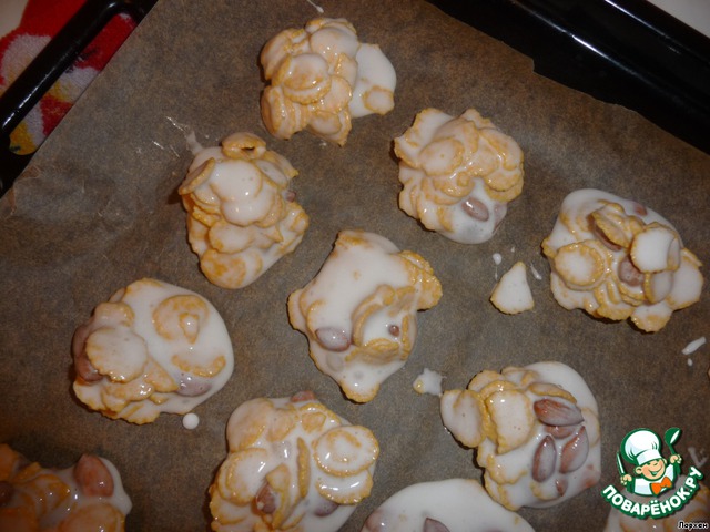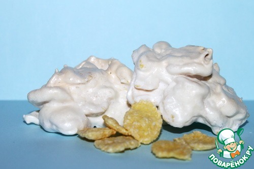 1. Холодные белки взбить в крутую пену, постепенно всыпать сахар. Перемешать с кукурузными хлопьями и миндалем.