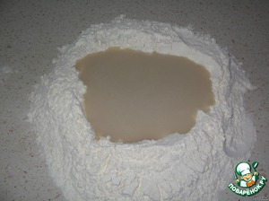 Муку смешиваем с семолиной (манная крупа мелкого помола) и просеиваем на рабочую поверхность горкой.