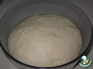 Через час тесто увеличится в 2 раза. Кладем его на посыпанную мукой поверхность, делим на две части ,и каждую раскатываем в прямоугольный пласт размером 25х35 см.