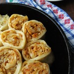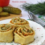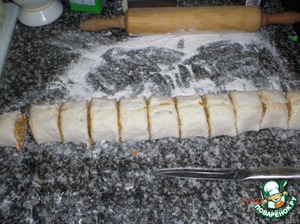 Сформировать рулет и порезать на кусочки сантиметров по 4.
