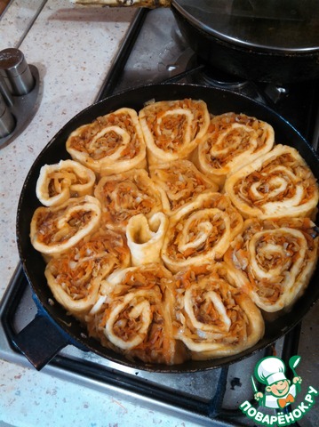 [+5]Тесто готовила по нем.рецепту: 1 яйцо + 100 мл воды + 3 ст.л. раст. масла + соль + погашенная сода... и муки ..сколько заберет...- до эластичности теста. Оставить на 0,5 час. под полотенцем, пока капуста готовится