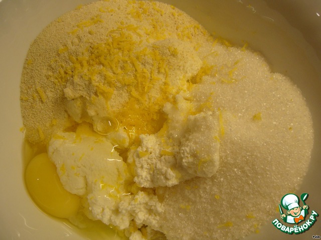 Творог, манку, сахар, яйцо, цедру половины лимона (натереть на мелкой терке), щепотку соли и ванильный сахар (по желанию) перемешиваем. И оставляем «подружится» ненадолго.