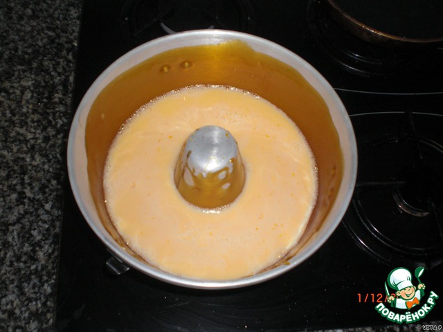 • Берём форму(24 см в диаметре)с отверстием,высыпаем 1 стакан сахара ставим на средний огонь и начинаем плавить , что бы получилась карамель. Очень осторожно, что бы не обжечь руки проворачиваем форму, что бы карамель равномерно распределилась по стенкам.