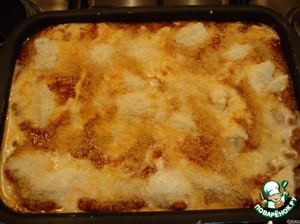 Когда всё налито и присыпано ставим в духовку 180 градусов примерно на 20-30 минут, пока не подрумянится сыр.
