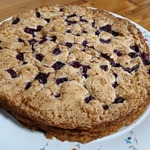 Потом застилаю форму пекарской бумагой, смазываю растительным маслом дно и края, потом выкладываю тонкий слой теста, на него можно яблочки выложить, ещё я с голубикой пекла замороженной, сахаром присыпала и сверху залила оставшимся тестом и отправила в духовку на час.