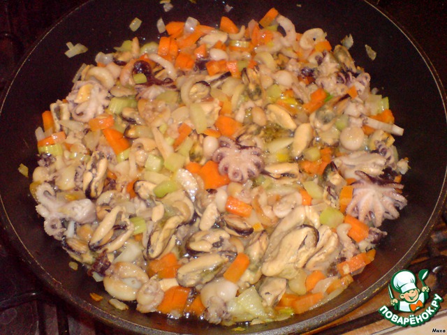 • Смешать овощи с морепродуктами в глубокой сковороде. Добавить чеснок. Оставить жариться на медленном огне.
