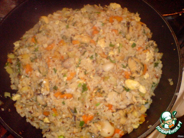 • Добавить к морепродуктам рис, омлет, тонко порезанный имбирь и зелень. Полить соевым соусом, добавить кунжут и перемешать. Жарить 5 минут.