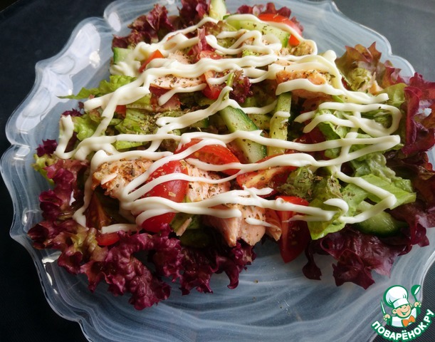 Примечание: сладковатая рыба хорошо дополняет этот всеми любимый овощной салатик. И выглядит нарядно.
