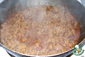 Пока фарш тушится, добавить к нему специи и 150 мл воды. Продолжать тушить, пока вся вода не испариться. По специям ориентируйтесь на свой вкус. Если любите по-острее, то можно добавить больше перца.