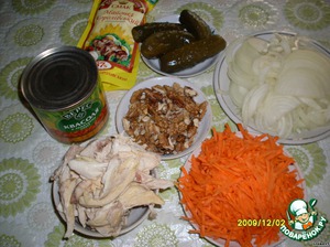 Отварное куриное филе порезать кубиками и обжарить. По отдельности обжарить лук, порезанный полукольцами, тертую на терке морковь и измельченные орехи. Огурцы порезать мелкими кубиками. Добавить консервированную в томатном соусе фасоль.