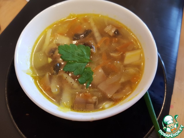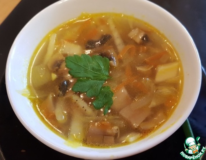 В кастрюлю с полуготовым картофелем забрасываем нарезанную соломкой капусту, доводим до кипения и забрасываем обжаренные овощи и грибы.