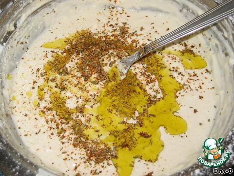 • В теплой воде тщательно растворить сахар, соль и дрожжи, всыпать стакан просеянной муки, размешать, влить масло и добавить приправу, еще раз хорошо размешать.