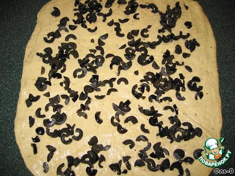 Равномерно распределить слой маслин, свернуть пласт рулетом.