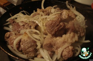 В хорошо разогретую сковороду положить подготовленное мясо и жарить в собственном соку и масле 5 мин, все время переворачивая, добавить лук и жарить еще 1-2 мин.
