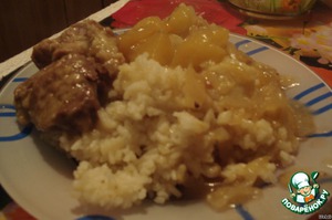Приготовим все ингредиенты. Свинину порезать на бруски длиной 3-5 см и толщиной 1-2 см, слегка отбить, посыпать солью, сахаром, специями. Лук нарезать полукольцами. Яблоки очистить от кожуры и сердцевины.