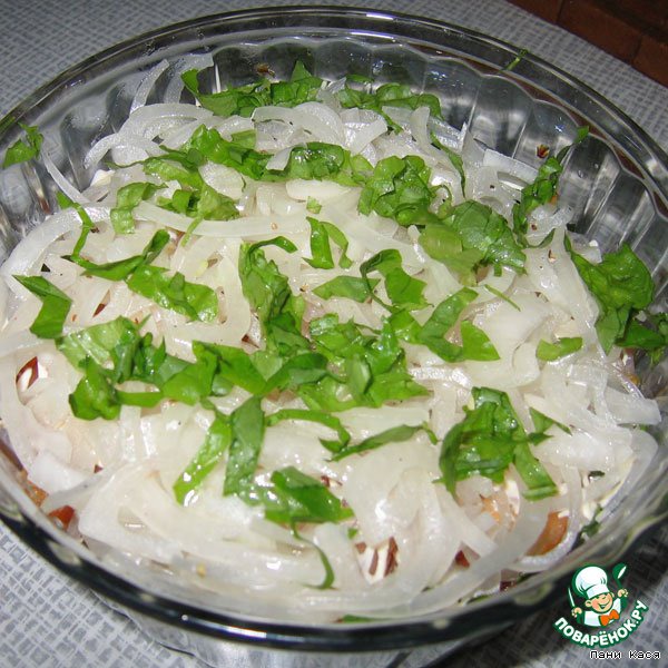 Замариновать лук нужно за 30-40 минут до того, как будете готовить салат (или ранее, например, утром, если вечером гости)