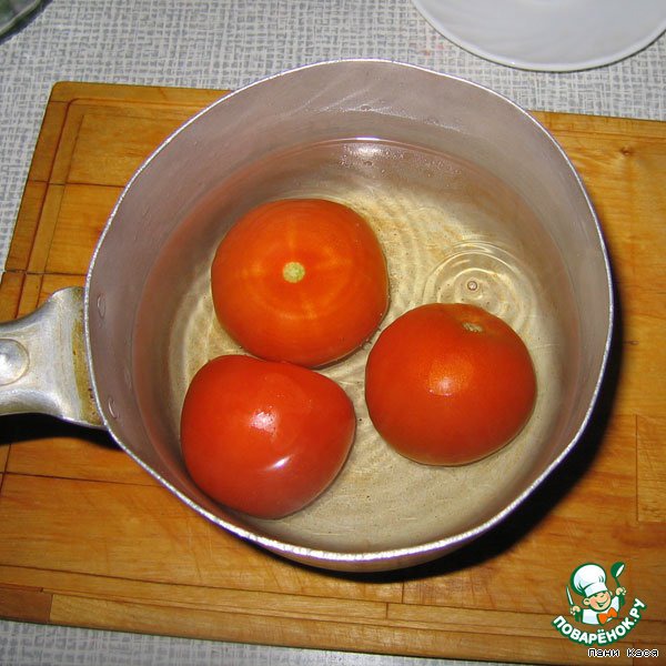 помидоры вымыть, наколоть у плодоножки, опустить на 1-2 минуты в кипяток (залить кипятком, не кипятить) -