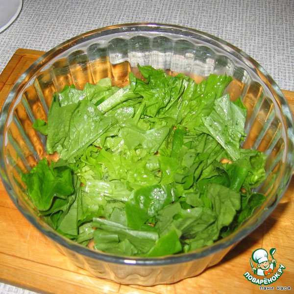На дно глубокой салатницы руками порвать салатные листья, устроить "гнездо"