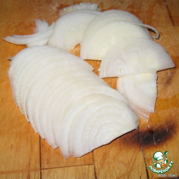 Луковицу почистить, порезать полукольцами, обдать кипятком -