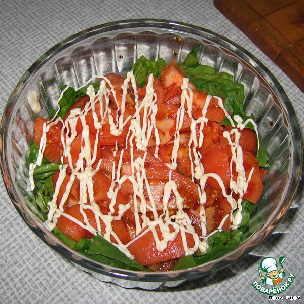 Выложить помидоры, чуть-чуть сбрызнуть майонезом (совсем немного!)