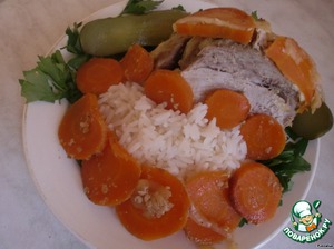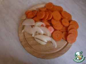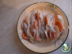 Когда мясо замариновалось, в надрезы укладываем дольки моркови и лука.