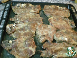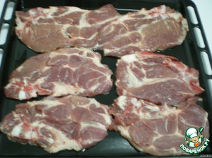 Противень чуть-чуть сбрызнуть водой. Выложить мясо, присолить поперчить и можно отправлять в духовку. -