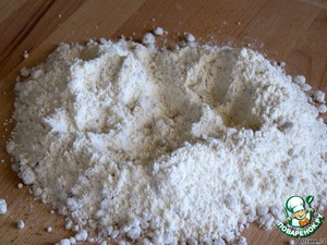 На рабочем столе смешать две муки (пшеничная и миндального ореха). Сделать в центре углубление-ямку и добавить все остальные ингредиенты. Цедру лимона и апельсина натереть на тёрке и тоже добавить в тесто. -