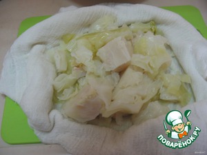 Взять марлю в несколько слоев. Капусту хорошо отжимать небольшими порциями.