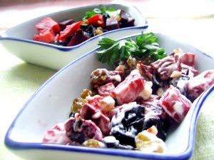 Свеклу, чернослив и изюм смешать в салатнице, добавить чеснок, пропущенный через чеснокодавку, и полить майонезом, еще раз все смешать - и салат готов.
