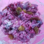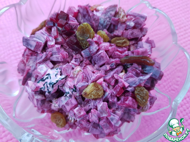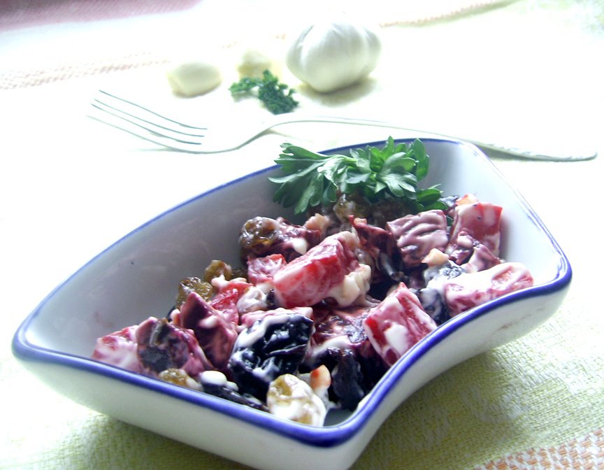 Свеклу, чернослив и изюм смешать в салатнице, добавить чеснок, пропущенный через чеснокодавку, и полить майонезом, еще раз все смешать - и салат готов.