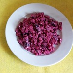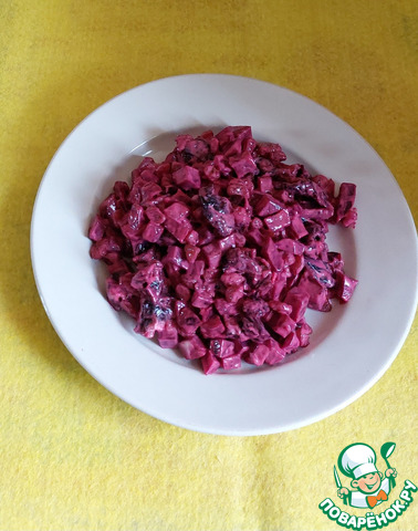 Салат готовится быстро, если не считать время варки свеклы. Приятный чесночный привкус. Рецепт проиллюстрирован пользователем a-lesa в рамках акции "Раскраски".
