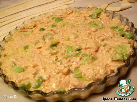 Выложить начинку в глубокую форму, смазанную жиром. Пирог на стол подается прямо в форме, поэтому лучше выбрать что-нибудь по-эстетичнее.