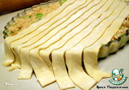 Накрыть начинку полосками теста, слегка внахлест. Для удаления излишков по бортику пройтись скалкой.