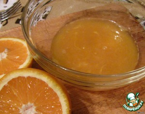 В широкую тарелку выдавливаем сок из трех апельсинов.